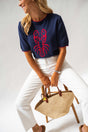 Casual yet distinctive, the Blue Harbor Sweater brings a unique touch to everyday style. It features a round neckline, short sleeves, and contrasting red trim, complete with standout lobster embroidery on the front. Knitted in soft fabric, it offers both comfort and character in one effortless piece.