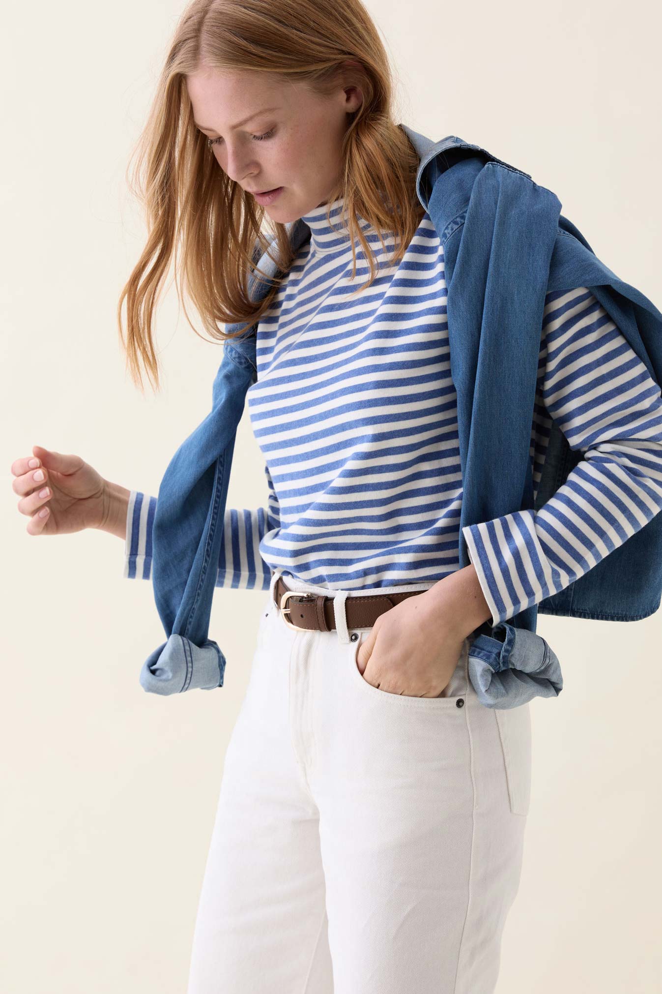 Laleham Blue Stripe Mock Neck Tee is backordered and will ship as soon as it is back in stock.